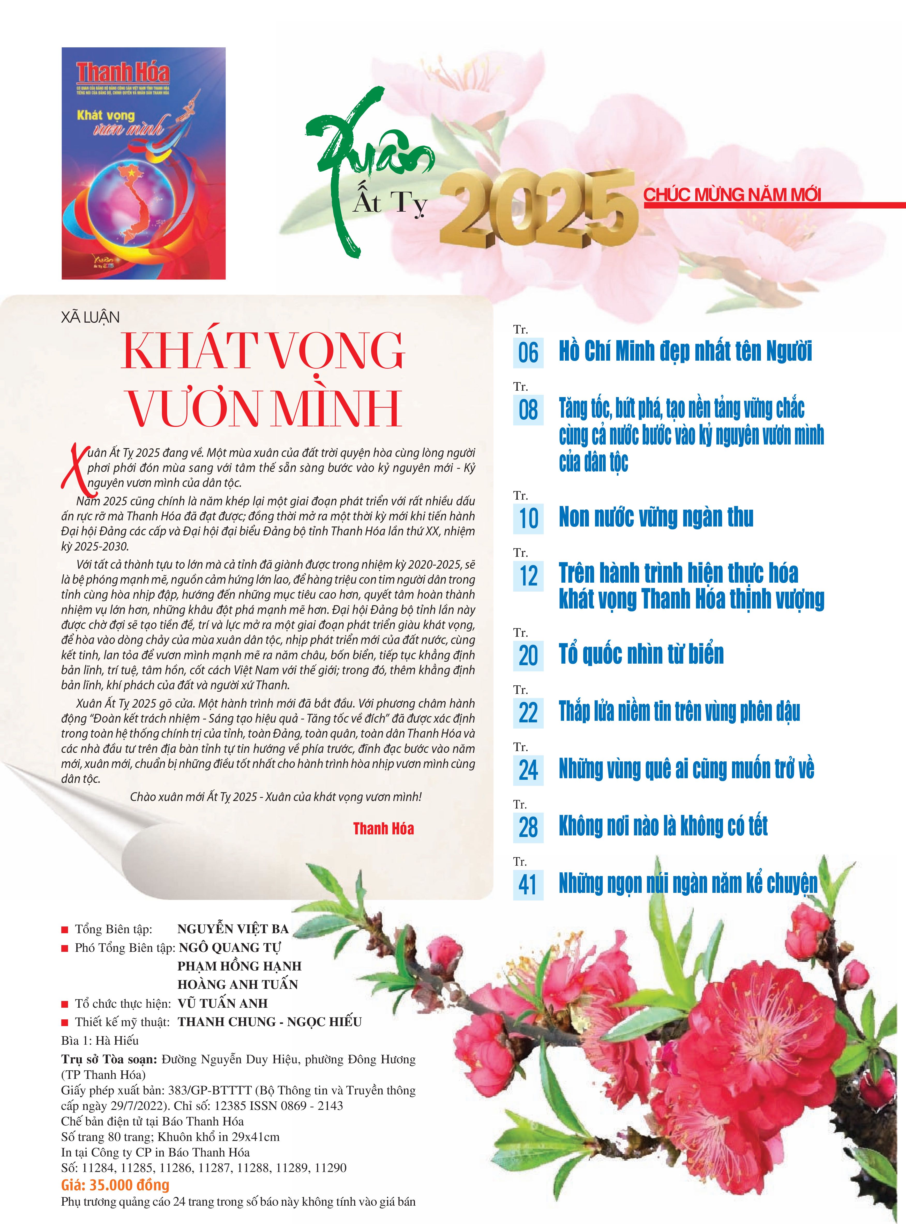 Xuân Ất Tỵ 2025 đã đến rất gần. Với mạch nguồn khát vọng vươn cao, hòa nhịp vào dòng chảy thời đại, dòng chảy phát triển; xuyên suốt là cảm hứng mùa xuân, phong vị tết, với cố gắng tạo ra một giai phẩm đẫm đượm sắc xuân, sức xuân, tô điểm cho bức tranh xuân đa sắc, nhiều thành công mà đất nước và tỉnh Thanh Hóa đạt được trong năm 2024, đang tiếp tục thể hiện quyết tâm bứt phá vươn tầm cao mới trong năm 2025, sẵn sàng bước vào kỷ nguyên mới - Kỷ nguyên vươn mình của dân tộc, Báo Thanh Hóa xuất bản giai phẩm Báo Thanh Hóa Xuân Ất Tỵ 2025 với chủ đề “Khát vọng vươn mình”.